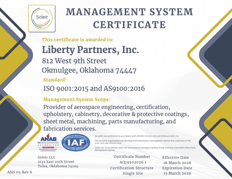 Liberty Partners, Inc. Achieves ISO 9001:2015 / AS9100:2016 Certification